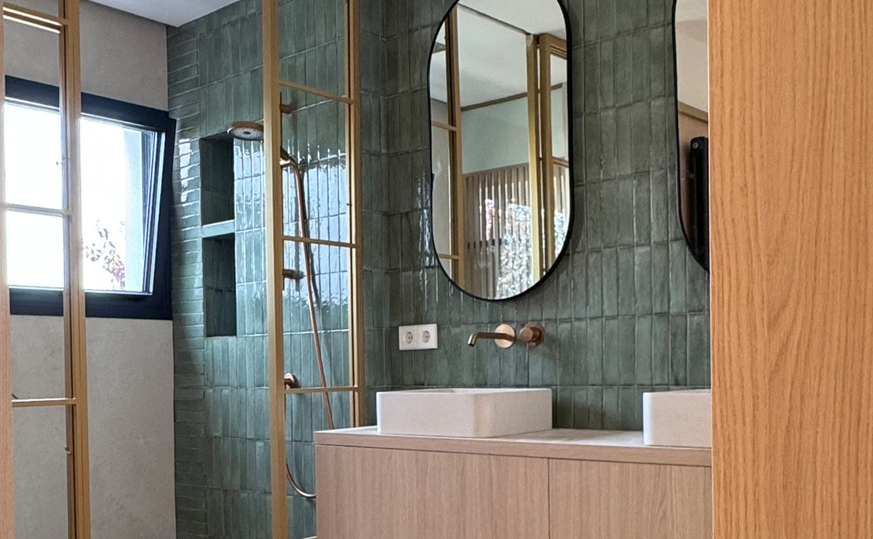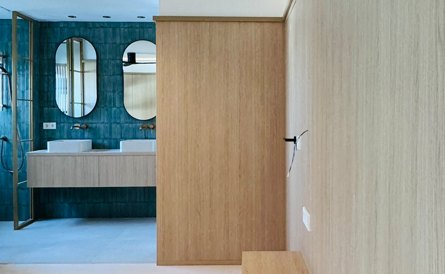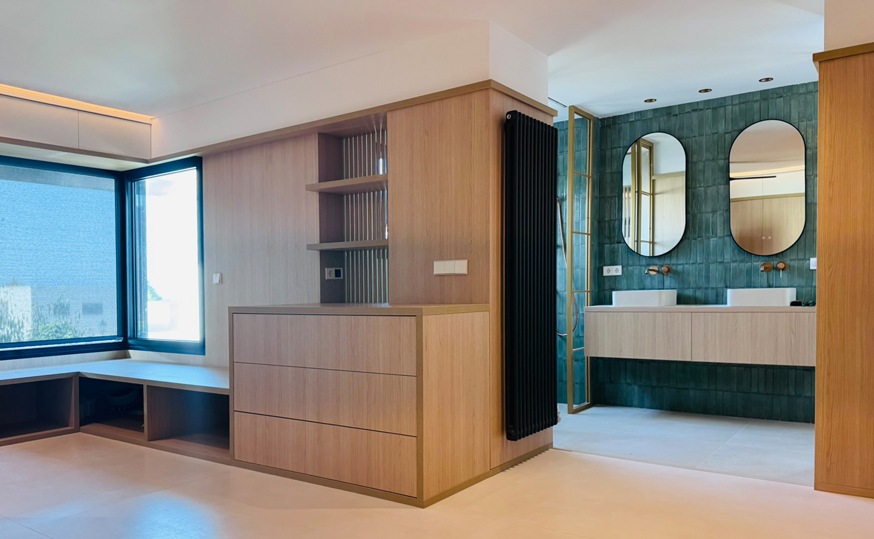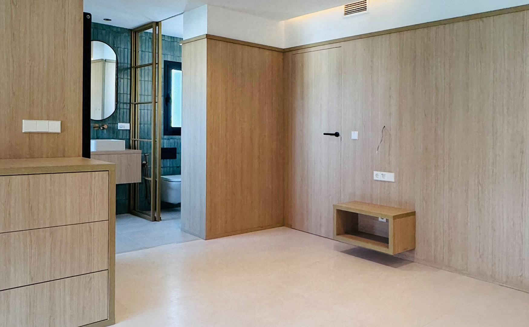 También se procederá a la reforma del baño, creando una conexión directa con el dormitorio principal. Se construirán dos núcleos cerrados en los extremos del baño para alojar la ducha y el inodoro, garantizando la privacidad necesaria. La zona de los lavabos se ubicará en el centro, manteniendo la conexión directa con el dormitorio. Se utilizarán materiales de alta calidad y acabados modernos para asegurar durabilidad y estética. Se maximizará el uso de luz natural en todo el espacio, aprovechando el gran ventanal y las conexiones abiertas entre las áreas.